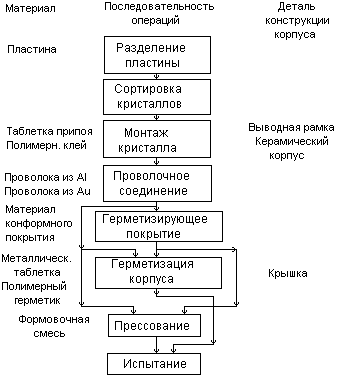 На второй стадии монтажа кристаллов контактные площадки со схемной стороны кристалла электрически соединяются с выводами корпуса. Соединение проволокой является наиболее важным способом монтажа кремниевых ИС. На схеме показана последовательность сборки с использованием такого вида соединения.
